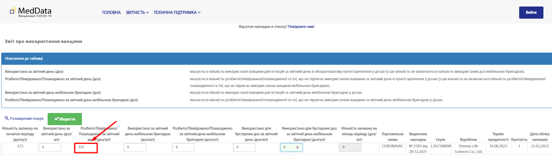 Розбито/Ліквідовано/Пошкоджено за звітний день мобільною бригадою (од.) - якщо вакцини було розподілено на мобільні бригади. В іншому випадку, лишаємо 0.