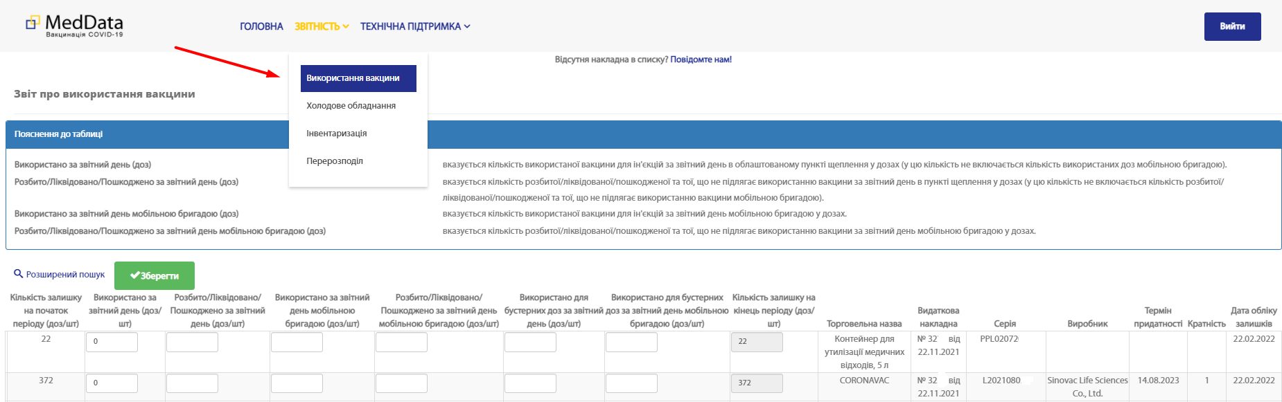 Кількість залишку на кінець періоду (од.) - після проставлення кількості використаних вакцин (2-й стовпець таблиці), залишок система рахує автоматично.