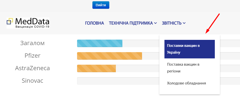 Для внесення інформації про розподіл вакцини на регіональні склади в системі необхідно перейти у форму Звітність-Поставки вакцин в Україну: