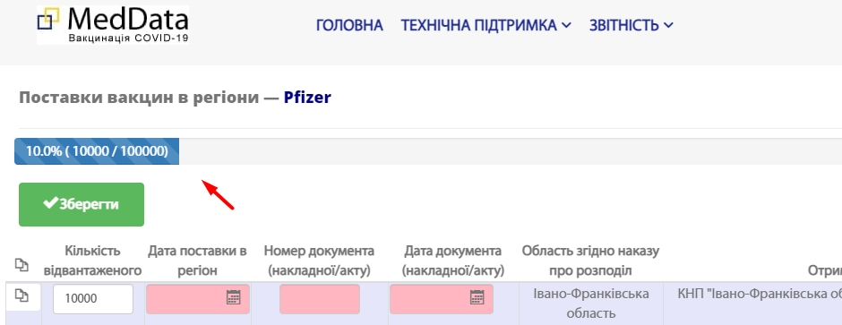 Зверху форми Поставки вакцин в регіони відображається інфографіка з даними про розподіл вакцини на регіони (у кількісному та відсотковому вираженні):