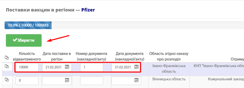 Далі перед користувачем відкривається форма розподілу даної вакцини, в яку вже автоматично було підтягнуто всі регіональні склади, на які буде/було здійснено розподіл/перерозподіл даної вакцини.