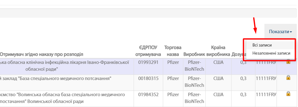 В системі передбачено можливість відфільтрувати дані в формі по незаповненим полям, натиснувши Показати та обравши Незаповнені записи: